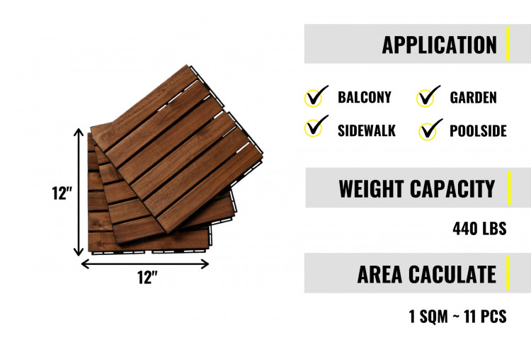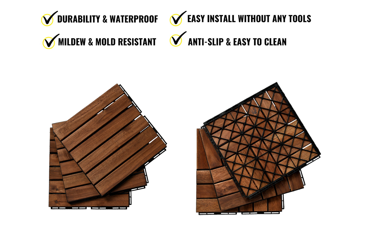 These wood flooring tiles will enhance your outdoor spaces. Made of acacia wood with a water-based oil coating, these wooden tiles are durable and water-resistant. They are perfect for both outdoor and indoor decoration such as a wall, balcony, garden, sidewalk, bathroom, poolside, deck, or any other areas you desire. These tiles come with interlocking snaps on the back for easy and quick installation with no tools required. The total weight capacity is 440 lbs.