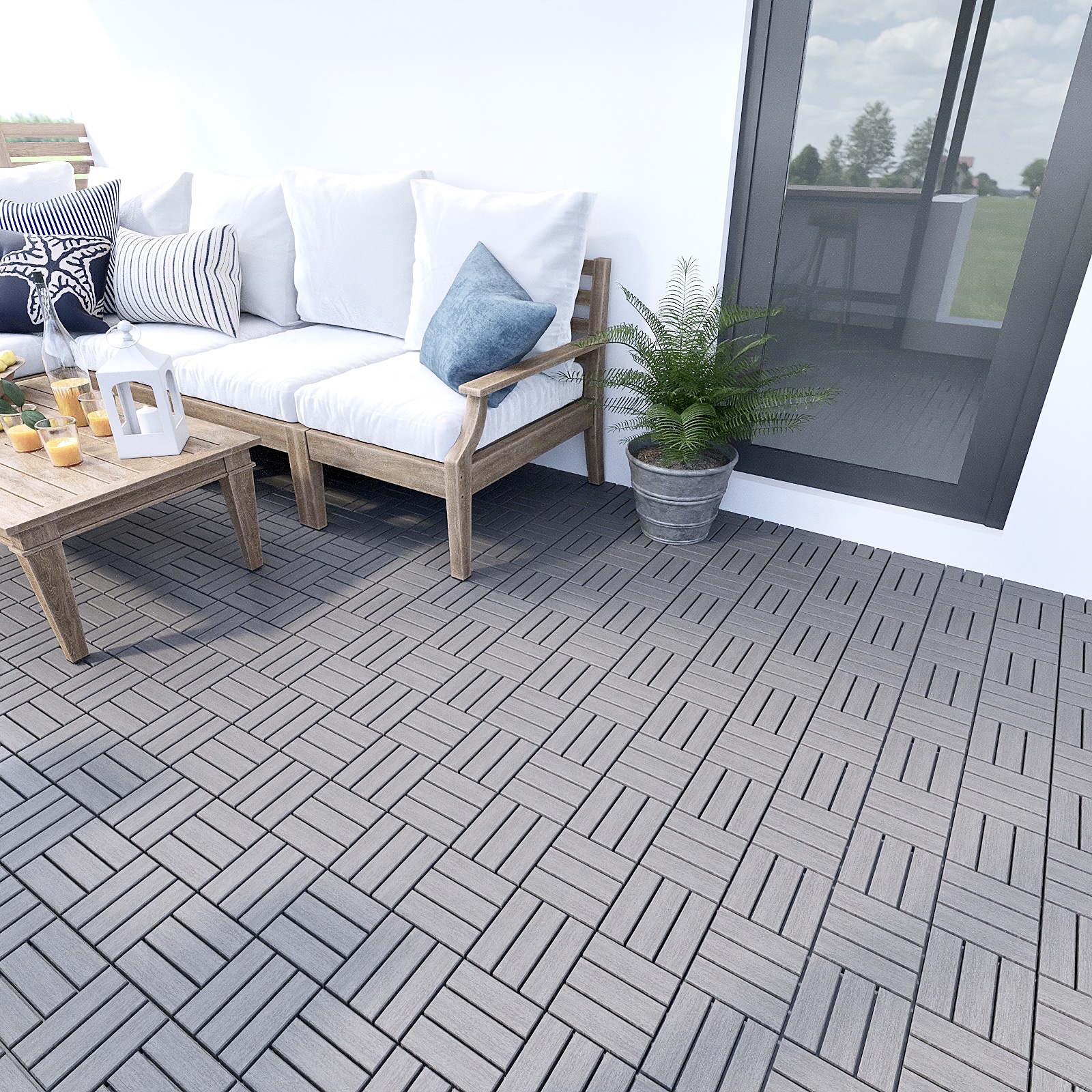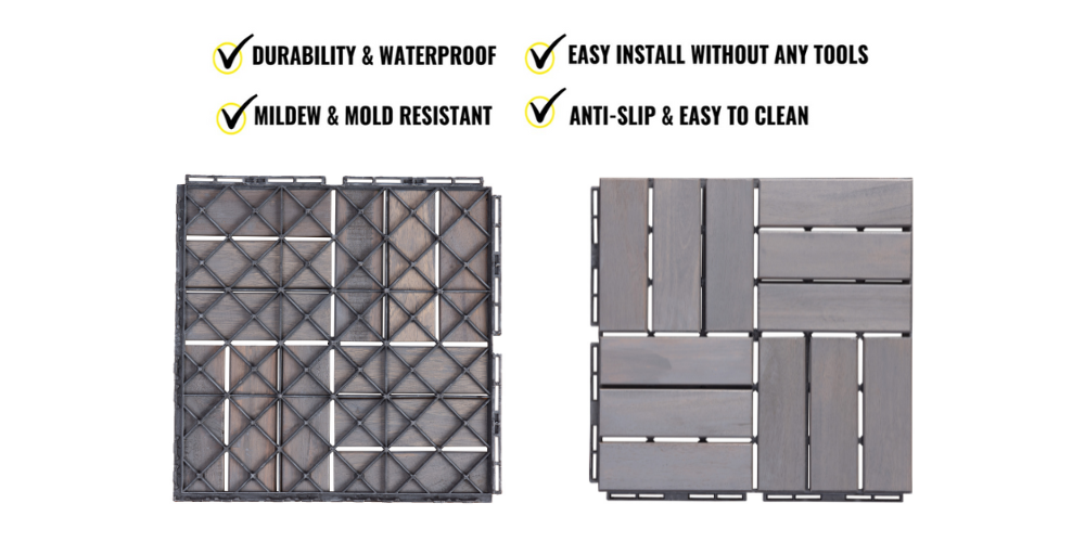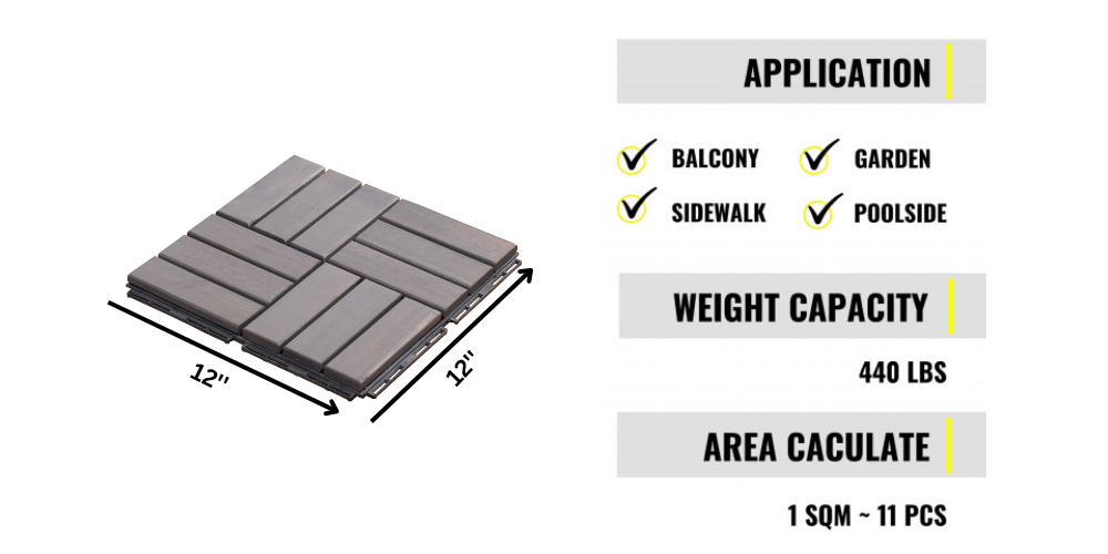 These wood flooring tiles will enhance your outdoor spaces. Made of acacia wood with a water-based oil coating, these wooden tiles are durable and water-resistant. They are perfect for both outdoor and indoor decoration such as a wall, balcony, garden, sidewalk, bathroom, poolside, deck, or any other areas you desire. These tiles come with interlocking snaps on the back for easy and quick installation with no tools required. The total weight capacity is 440 lbs.